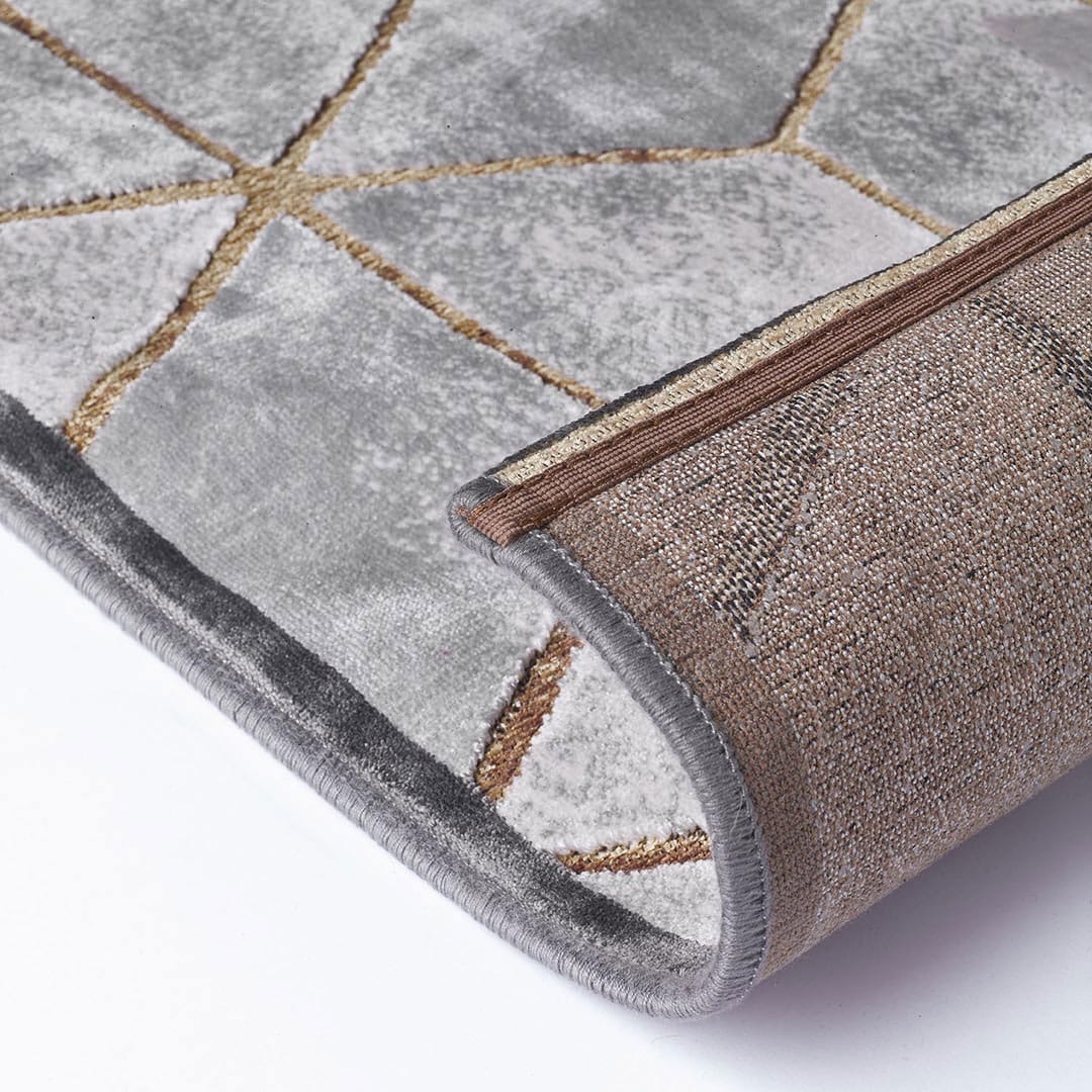 The Gabrielle 755X/Q13 Grey/Gold rectangular rug – 3D cube geometry reinterprets tridimensional design with elegance and modern sophistication. The geometric cube pattern, combining shades of grey with refined golden accents, creates a luminous and elegant optical effect that adds depth to interiors. Perfect for living rooms and dining spaces with a strong yet refined character.