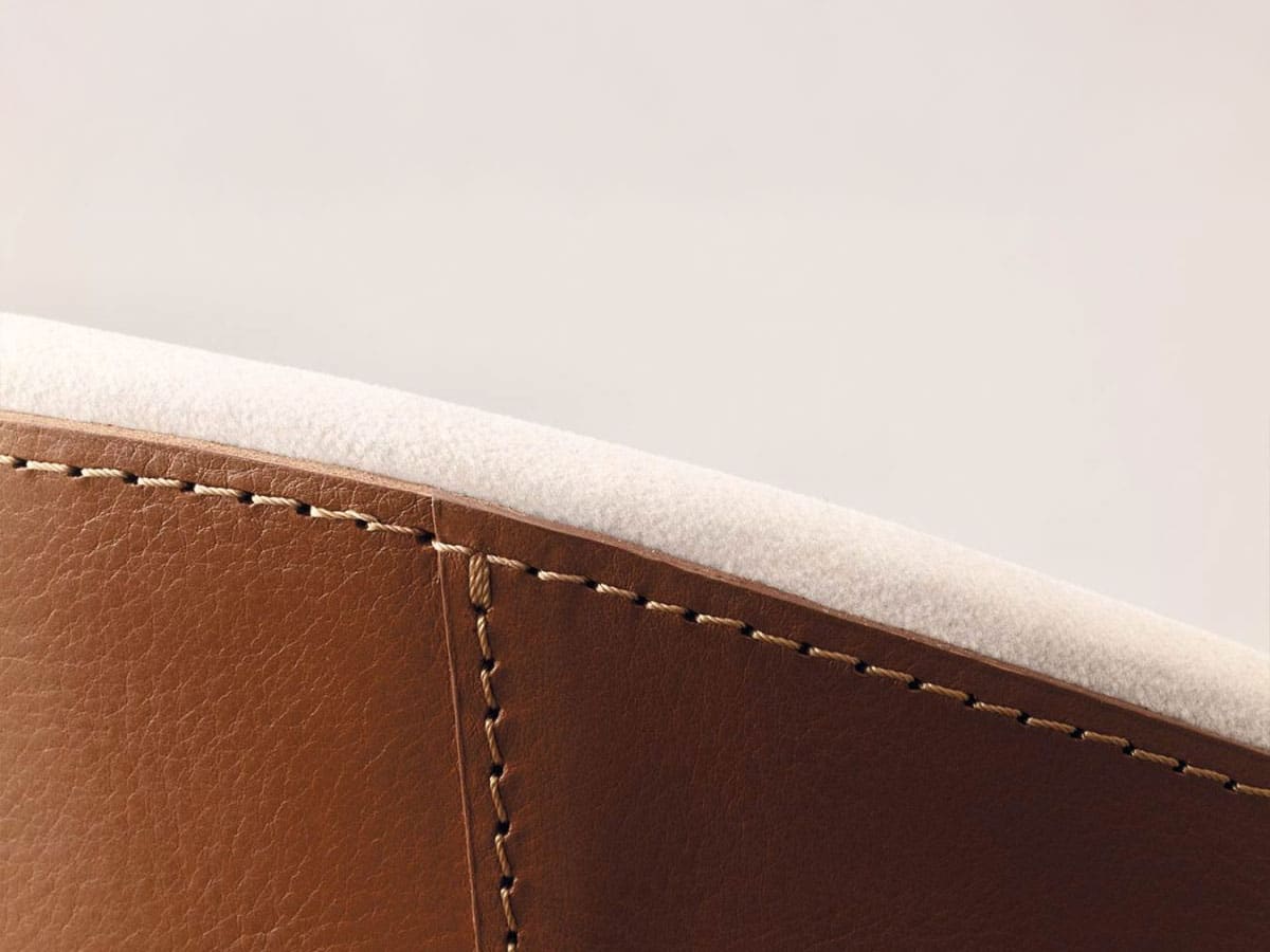 Frutto della creatività di Edi e Paolo Ciani, questa seduta di design coniuga la purezza del tubolare in metallo verniciato con la nobiltà dei materiali naturali: cuoio vacchetta o cuoietto per l’esterno della scocca e tessuti pregiati per l’interno, offrendo infinite possibilità di abbinamento tra texture e colori, nel segno della personalizzazione più raffinata.