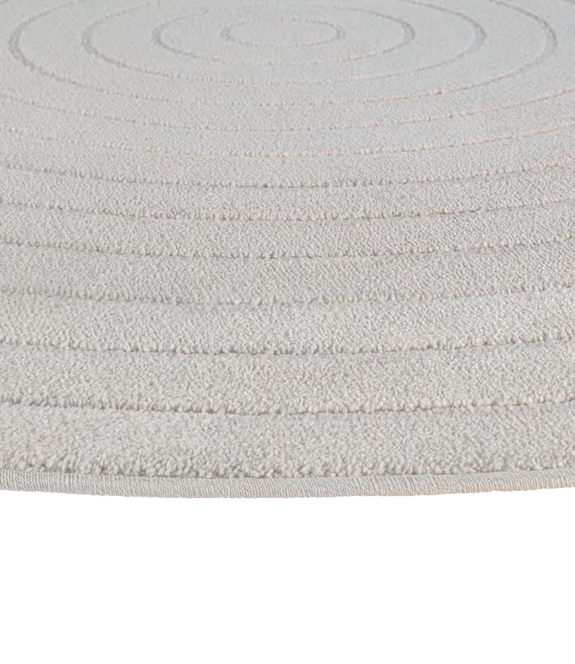 Round ivory rug with refined design. Composition: 100% Heat-Set polypropylene. Pile height: 30 mm. Total thickness: 32 mm. Weight: 3700 g/m². Diameter: 240 cm.