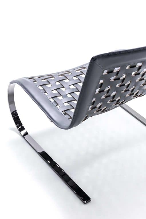 Le fauteuil sur les photos est réalisé avec la structure en finition traitement galvanique “444 Noir Nickel” et avec l’assise en cuir couleur “32 Gris Argile“.
