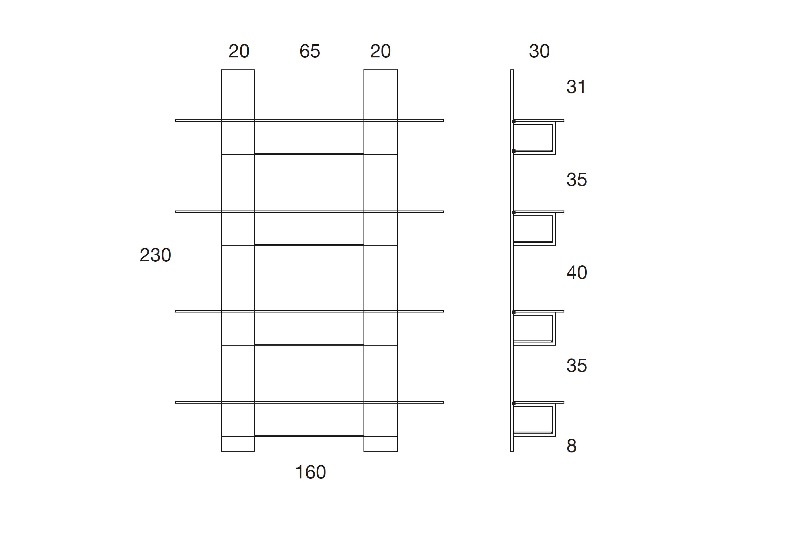 Les dimensions du meuble bibliothèque mural à étagères sont les suivantes: cm. 160 x 32 x h. 230.